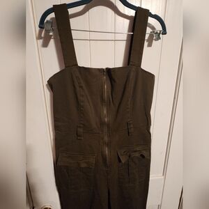 size L olive green jumpsuit. straight leg bottom with cuff. zipper detail in front. comfy and great for a quick outfit.