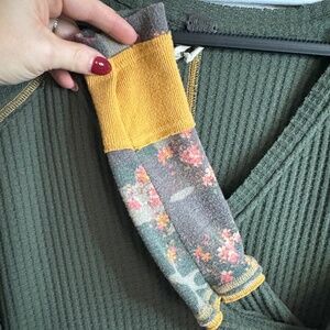 Free People We The Free Lovin Leopard Green Thermal Waffle Long Sleeve over size Tunic Top. Womens size small with raw edge v-neck that can be worn on or off the shoulder. Good condition.