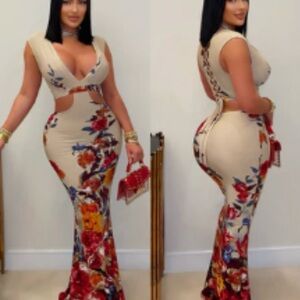 Stunning floral maxi dress with a plunging neckline. Features a beautiful blend of cream and vibrant floral patterns, perfect for any occasion.