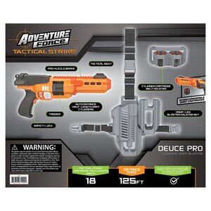 The Deuce Pro delivers next-level dart blasting with a removable nozzle extender and three auto-advancing dart cylinders for nonstop action. Load up with 18 included half-length Adventure Force Pro Darts and fire over 125 feet! Stay ahead of the game with an adjustable sight and a drop-leg holster for quick access. Perfect for outdoor or open spaces. Recommended for ages 14+, the Deuce Pro is available only at Walmart and Walmart.com.