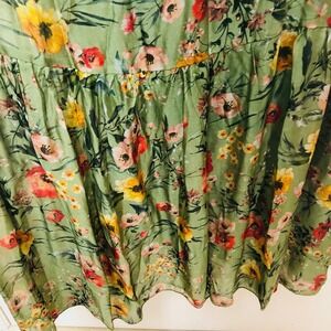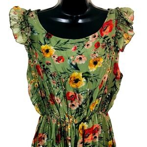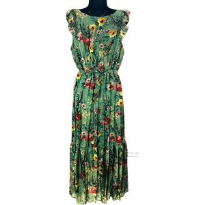 1837. Le Raganne. Good condition - minimal wear - free of rips, tears, stains, pet/smoke odors. Maxi. Lined. Round neck. Sleeveless. Ruffles. Elastic waist. Green floral print. Forest Fairy. Romantic. Feminine. Tiered. Made in Italy. Viscose/Silk. Size Large. Shoulder 13.5. Bust 40-44. Length 50. Experienced seller.