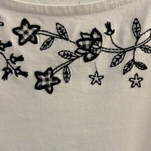 Chic white long sleeve top with intricate black embroidery. Ideal for a stylish look.