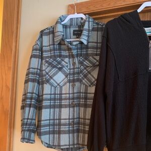 Stylish plaid shacket (Love Tree), Urban outfitters hoodie, and a Koral brand sweatshirt featuring vibrant pink star accents on the sleeve.