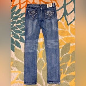 Montana Jeans juniors skinny jeans in a flattering medium wash with crystal button, rhinestone rivets, and embellished back pockets. Stretchy denim with whiskering and fading for a broken-in look. Tall-girl friendly with a full 32” inseam.
