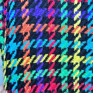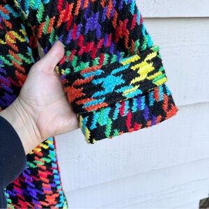 Sam Edelman Multicolor Houndstooth Coat Rainbow Colorful Artsy Bold Size 12. Bold, eye-catching statemet coat, vibrant multicolor houndstooth plaid with black base, fully lined. Tailored silhouette with a classic notched label, double-breasted, front pockets. Dopamine dressing, fashion-forward, pride.
