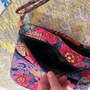 Vera Bradley retired pattern that is Vibrant and stylish. This floral patterned women's bag is perfect for adding a pop of color to any outfit. The multicolored design features shades of pink, orange, blue, and black, making it a versatile accessory for any occasion. Adjustable strap for length.