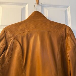 Chic brown leather jacket by Quince. Ideal for versatile styling. Quality staple for any wardrobe. Designer elements and cut- flattering and elevated! Buttery soft leather.