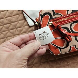The NWT Coach 25121 Poppy Floral Flower Print Scarf Crossbody is a stylish and versatile accessory for women. This small rectangular bag features a vibrant red and black floral pattern, with gold-plated hardware accents. The crossbody strap with a red patent leather handle adds a trendy and practical touch, perfect for various occasions including travel, parties, casual outings, and business events. Made from durable canvas material with a fabric lining, this Coach Poppy bag comes with a dust bag and a charming accessory, making it a must-have addition to any fashion-forward wardrobe.