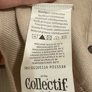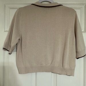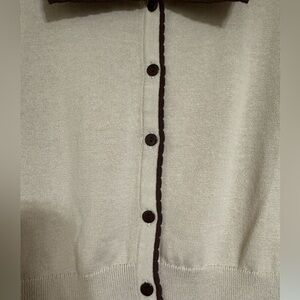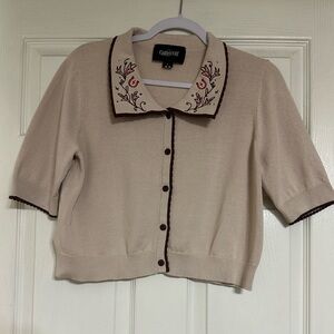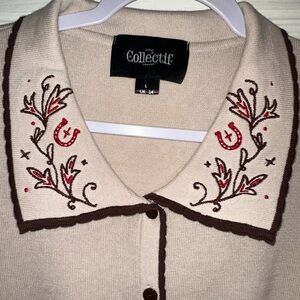 UK vintage-inspired brand Collectif Jessy cowgirl cardigan top. 100% cotton knit 3/4 sleeve cardigan in cream/oatmeal color. Chocolate brown scallop detail on cuffs, collar, and button placket. Red and brown floral and horseshoe embroidery on collar. Rockabilly, retro, western.