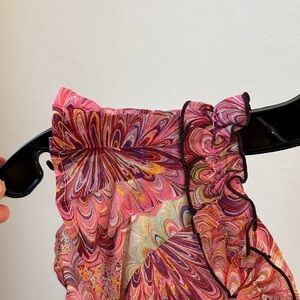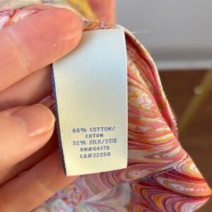 Cotton and silk top - beautiful color detail with ruffle on front and around neck. Looks perfect with dark jeans in fall or white slacks in summer. Soft and high quality. In perfect condition. Fits like an XS/S.