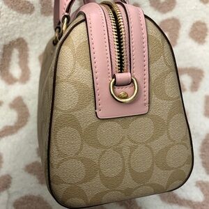 Stylish Coach satchel with pink accents. Signature tan pattern. Comes with original crossbody strap. I would say the condition is Excellent as I only used this a handful of times and has been sitting on my shelf. I’m not in a rush to sell so I’m kind of firm on my price.
