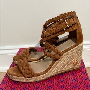 Step out in style with these chic braided tan wedge sandals. Perfect for any occasion, these shoes offer both comfort and elegance.