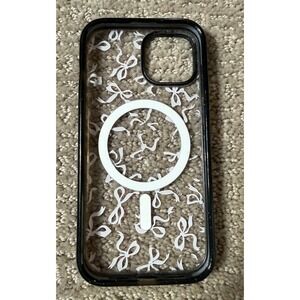 Keywords: iPhone 15 case, clear case, pink bows, MagSafe compatible, recycled materials, designer case, protective case, phone accessory, fashionable, cute phone case, wireless charging, slim case, stylish protection