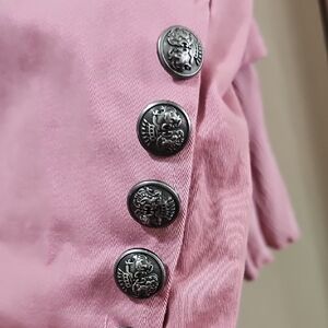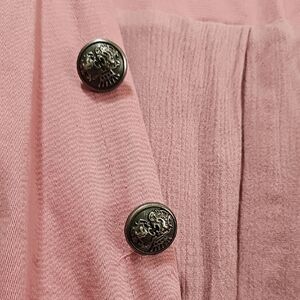 Chic pink blazer with unique button-front. Perfect for layering. Enhances any outfit.