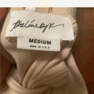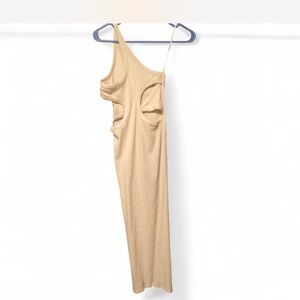 Step out in style with this elegant tan one-shoulder dress. Perfect for any occasion, this dress offers a chic and sophisticated look. The line by K tan/cream, one shoulder strap dress with cut out on back of dress on both sides. About 49 inches from top of strap to bottom of dress from Pitt to Pitt about 13 inches. #fitteddress #ribbeddress