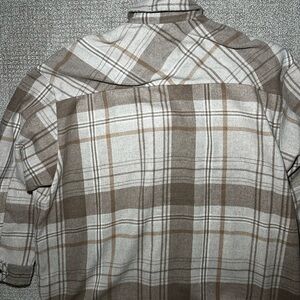 Stylish plaid button-up shirt with chest pockets. Features a blend of cream and brown tones.