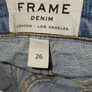 The FRAME Denim Le High Skinny Stagger Cut Raw Hem Zippered Jeans in size 26 are a stylish and versatile addition to any woman's wardrobe. Made from a comfortable cotton blend denim fabric with a solid blue color, these jeans feature a zip closure, raw wash, and a trendy 5-pocket design. The high rise waist and skinny style offer a flattering fit, perfect for the summer, fall, and spring seasons. Additionally, the brand's reputation for quality ensures durability and long-lasting wear. These jeans are a must-have for any fashion-forward woman looking for a chic and trendy bottom wear option.