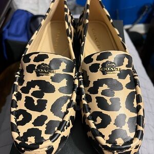 Elegant Coach shoes with a bold leopard pattern. Ideal for versatile styling.