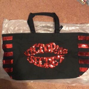 Victoria Secret Tote Bag, Black tote bag with Red sequins, Victoria’s Secret written on the front in Red sequins, & 5 lines of Red sequins on each side of the Bag, Has a zipper & handle, Inside pocket with love Victoria written on it, Super nice bag, Measuring approximately 25-1/2” x 13-1/2” x 6”, NWT