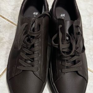 H&M men’s brown faux leather lace-up sneakers. Clean, minimal design perfect for everyday casual wear, work, or errands. Never worn. Rubber sole with classic low-top silhouette.