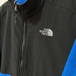 The North Face Boys Denali Fleece Jacket in Blue and Black, size XL (18/20). This classic outdoor staple features the signature Denali design with reinforced nylon overlays at the chest and elbows for added durability.