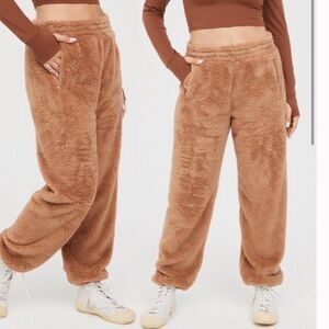 Aerie Teddy Fluffy Camel Tan Pull On Jogger Pants Zipper Pockets Size Medium