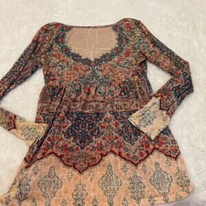 One World Vtg Y2K Babydoll Top Boho Indie Multicolor Print Size M Made In USA