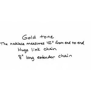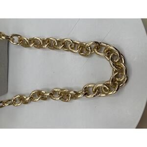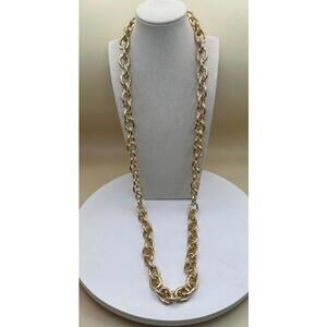 This gold chain necklace features large, interlocking links for a bold statement look. The necklace is long, versatile, and can complement various outfits. Its polished finish adds a touch of elegance. Suitable for daily wear or special occasions.