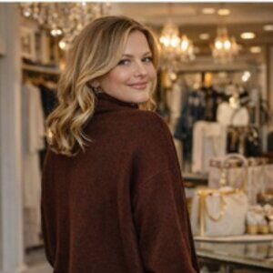 This rich, warm brown cardigan features a clean, minimalist open-front design that layers seamlessly over dresses, blouses, or elevated casual looks. The fabric has a substantial yet breathable feel — perfect for transitional seasons or year-round layering in climate-controlled spaces.