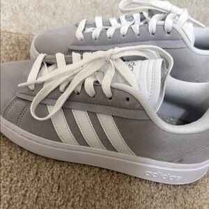 Sleek Adidas Cloudfoam comfort shoes in gray with white accents. Ideal for everyday style.