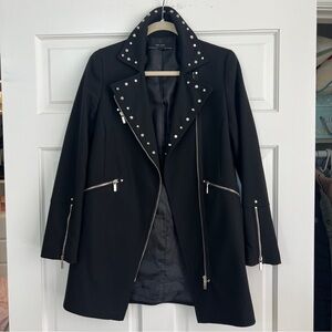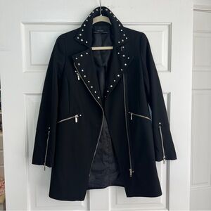 Stylish black trench coat. Features silver studs and zippers. Perfect for a chic look.