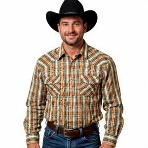 Levi's long-sleeve western shirt featuring a brown and orange plaid pattern and pearl snap buttons. The shirt has a classic western design with a point collar, pointed yokes on the front and back, two snap-flap chest pockets, and pearl snap closures on the cuffs and front placket. Classic plaid design with button front. Features two chest pockets. Ideal for casual wear.