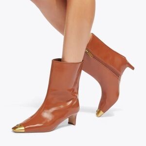 Elegant tan leather boots with striking gold toe detail. Perfect for adding a touch of luxury to any outfit.