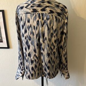 Stylish animal print blouse. Button-up front. Long sleeves. Perfect for any occasion.