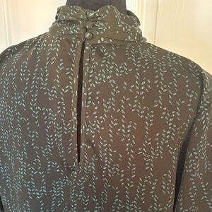 Prologue Dark Chocolate Blouse with Green Leaf Print. Size medium. Gorgeous high neck with three button clasp. Quarter length sleeves with beautiful tucking. Special details that add flair to the blouse. Great for fall and winter. Wear with jeans or dress up with slacks. Layer with a fun vest.