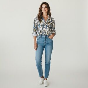 Stylish shirt with intricate multicolor design. gold hardware