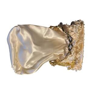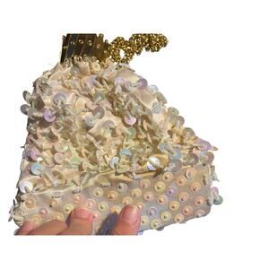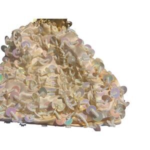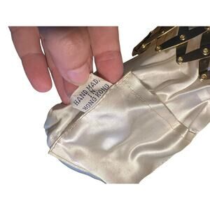 This vintage expandable gate top accordion purse, designed in the style of a beggars bag, is a unique addition to any collection. The white sequin material, made in Hong Kong, gives the purse a sparkling look that is perfect for everyday use. With its original and authentic style, this purse is a must-have for women who love vintage accessories. The purse is perfect for carrying essential items and can be expanded to fit any occasion. Don't miss out on this one-of-a-kind piece! Missing cap closure, water staining on bottom corner and bottom- please see pictures.