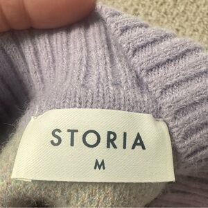 Excellent condition Storia sweater featuring a striking purple and green color block design. This crew-neck sweater showcases a unique geometric pattern with fringe at the edge.