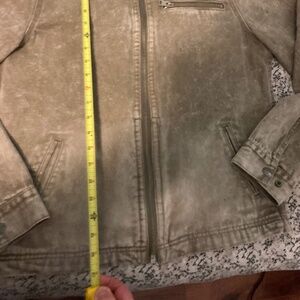NWOT denim jacket in light brown/tan. Please see images for measurements. It is a size Small, but I usually wear Medium/Large and this fits fine on me. 10/10 condition. AllSaints Rothwell Jacket has a cool fade effect on the lower half of the front side. Light distressing on bottom seam by design. Purchased for $329 retail.