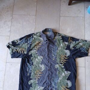 Vntg TOMMY BAHAMA Hawaiian Men's Silk Shirt XL Blue Leaves On Gray