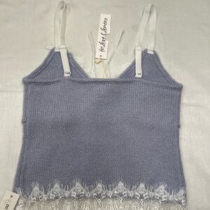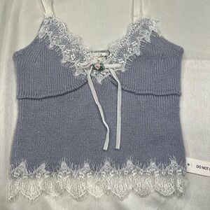 Lavender tank top with delicate lace trim. Features adjustable straps and bow detail.