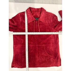 Keywords: suede jacket, leather jacket, red jacket, women's outerwear, designer jacket, casual jacket, fall fashion, winter wear, genuine leather, kangaroo pocket, half zip, drawstring detail, classic style