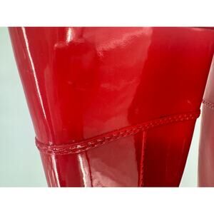 A pair of sleek, red knee-high rain boots with a glossy, patent finish. These boots have a modern and polished look, featuring a strap around the ankle with a silver "MK" logo emblem, from Michael Kors. The boots have a simple, clean design, with minimal stitching and no additional adornments, which keeps the focus on the shiny finish and logo detail. The soles are flat, making them practical for everyday wear, particularly in wet or rainy conditions. The overall style is chic and versatile, easily pairing with a variety of outfits for both casual and stylish occasions.
