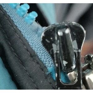 The zipper has a piece missing on the bottom shown in a picture. Also it appears the black zip pull is a replacement. It's difficult to zip it up and once it's zipped up, the zipper appears wavy. There's wear on the interior sleeves by the cuff. Should come out with oxiclean or your preferred stain remover.