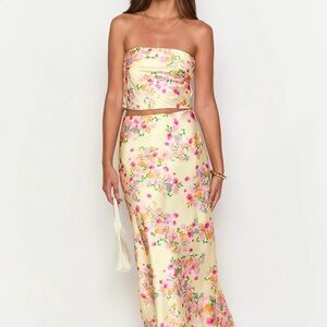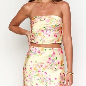 The Genevieve Yellow Floral Strapless Satin Top is a fresh, floral addition to your summer wardrobe! Featuring a strapless design with an elegant fold over detail at the bust, this lightweight satin top offers a chic, feminine look.