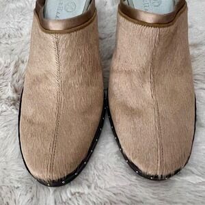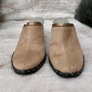 Cole Haan tan fur (pony hair) mules with studded detail & block heel. These slip-on shoes offer a chic and sophisticated look, perfect for adding a touch of elegant flair to your ensemble. The Neutral Tan matches everything!