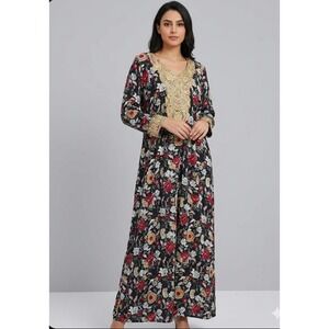 Embellishments and features: Allover paisley print, border-style print framing the neckline, center front, and sleeve cuffs, and small rhinestone accents along the neckline and front placket area for a touch of sparkle; pullover construction with no zipper or front buttons.