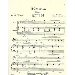Homing is a well-known early 20th-century art song that enjoyed significant popularity in recital and recording during the 1910s–1920s. This is a complete vintage sheet music copy, suitable for singers, pianists, teachers, or collectors of classical vocal repertoire.