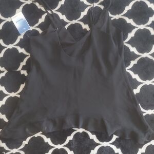 This chic black camisole from Abound features a stylish asymmetrical design with delicate ruffles, offering a modern twist to a classic sleeveless top. Perfect for layering or wearing on its own, it adds a touch of elegance to any outfit.