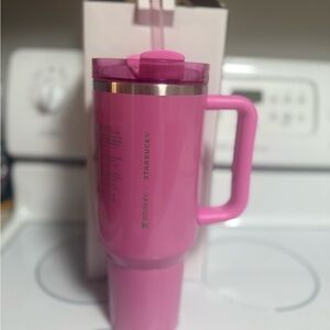 Enjoy your drinks on the go with this vibrant pink Stanley travel mug. Designed with a convenient handle for easy carrying.